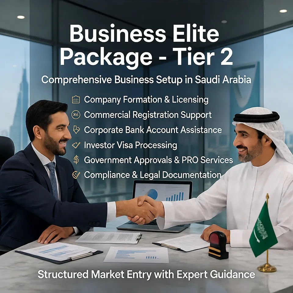The Business Elite Package – Tier 2 is a comprehensive business setup solution designed for entrepreneurs who require enhanced support while entering the Saudi Arabian market. This package includes company formation, licensing, and structured legal documentation to ensure a smooth setup process. Clients receive expert consultation to select the most suitable business activity and structure aligned with their objectives. The commercial registration process is managed efficiently to meet regulatory requirements. The package also includes assistance with opening a corporate bank account to support financial operations. Investor visa processing support is provided to facilitate business mobility. Government approvals are handled through professional liaison services to avoid delays. Clients are guided through compliance requirements to ensure adherence to local regulations. Office setup advisory is included to help establish a functional business presence. PRO services are provided to manage administrative procedures effectively. The process is streamlined to reduce complexity and save time. This package is ideal for growing businesses and investors seeking a balanced level of support. It ensures a stable and well-structured entry into the Saudi market while maintaining flexibility for future expansion.