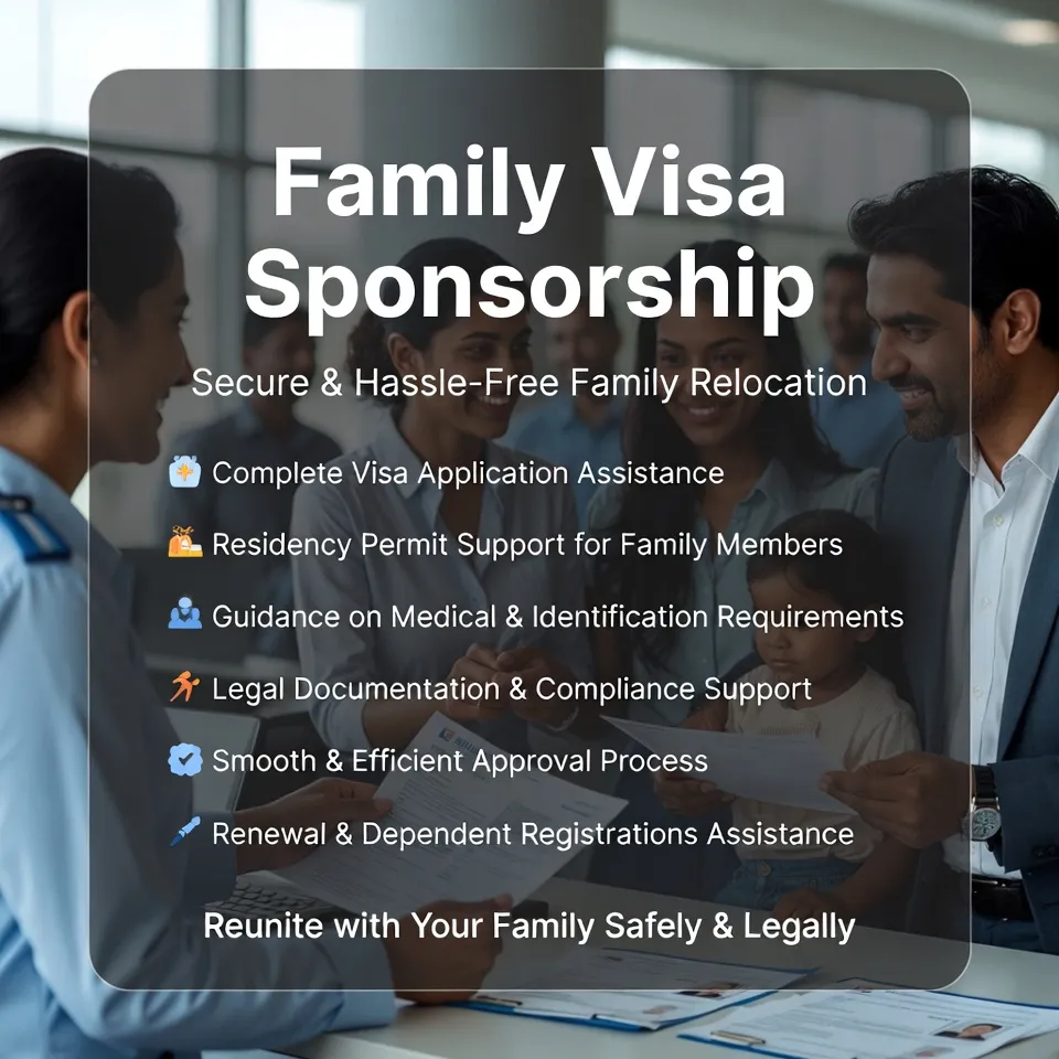 Family Visa Sponsorship is designed to help residents bring their immediate family members to live with them legally and comfortably. This service provides complete assistance with the family visa application process. It includes guidance on eligibility requirements and documentation preparation. Clients receive support in submitting visa applications correctly and efficiently. The process also covers assistance with residency permits for family members. Medical and identification requirements are guided professionally. Support is provided for completing necessary legal formalities. The service ensures compliance with local immigration regulations. Clients are assisted throughout the approval process to avoid delays. Renewal support is also available when required. Guidance is provided for dependent documentation and registrations. The process is structured to ensure a smooth family relocation experience. This service is ideal for professionals wishing to reunite with their families. It ensures a secure and hassle-free sponsorship journey.