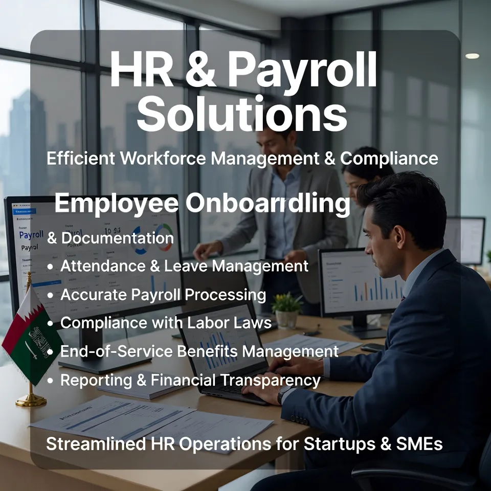 HR & Payroll Solutions are designed to help businesses manage their workforce efficiently while ensuring compliance with local labor regulations. This service provides end-to-end support for employee management and payroll administration. It includes employee onboarding and documentation processes. Attendance and leave management systems are also supported. Payroll processing is handled accurately and on time. The service ensures proper salary calculations, including allowances and deductions. Compliance with labor laws and statutory requirements is maintained. Support for employment contracts and policy documentation is included. The solution also covers end-of-service benefits management. Tax and contribution guidance is provided where applicable. Businesses receive reporting and record-keeping support. The system helps improve transparency and operational efficiency. It reduces administrative workload for management teams. This service is ideal for startups, SMEs, and growing organizations. It ensures smooth HR operations and reliable payroll management.